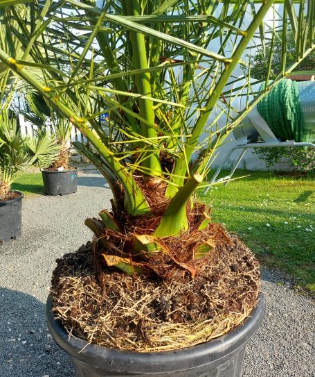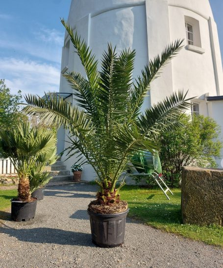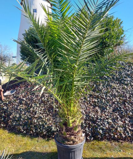 Die Phoenix canariensis, auch bekannt als Kanarische Dattelpalme, ist eine beeindruckende Pflanze, die häufig in südländischen Ländern in Gärten und Parks zu finden ist. Sie zeichnet sich durch ihren aufrechten Stamm und die kaiserlichen fächerförmigen Blätter aus, die eine satte grüne Farbe haben. Diese Palmen können eine Höhe von bis zu 20 Metern erreichen und bringen mit ihren eleganten Blättern ein tropisches Flair in jedes Gartenambiente. Die Blüten erscheinen in langen, hängenden Trauben und sind eine wichtige Nahrungsquelle für verschiedene Insektenarten. Die Phönix canariensis ist nicht winterhart und benötigt deshalb ab minus 5 Grad Celsius einen ausreichenden Winterschutz. Der Standort sollte sonnig bis Halbschatten sein.